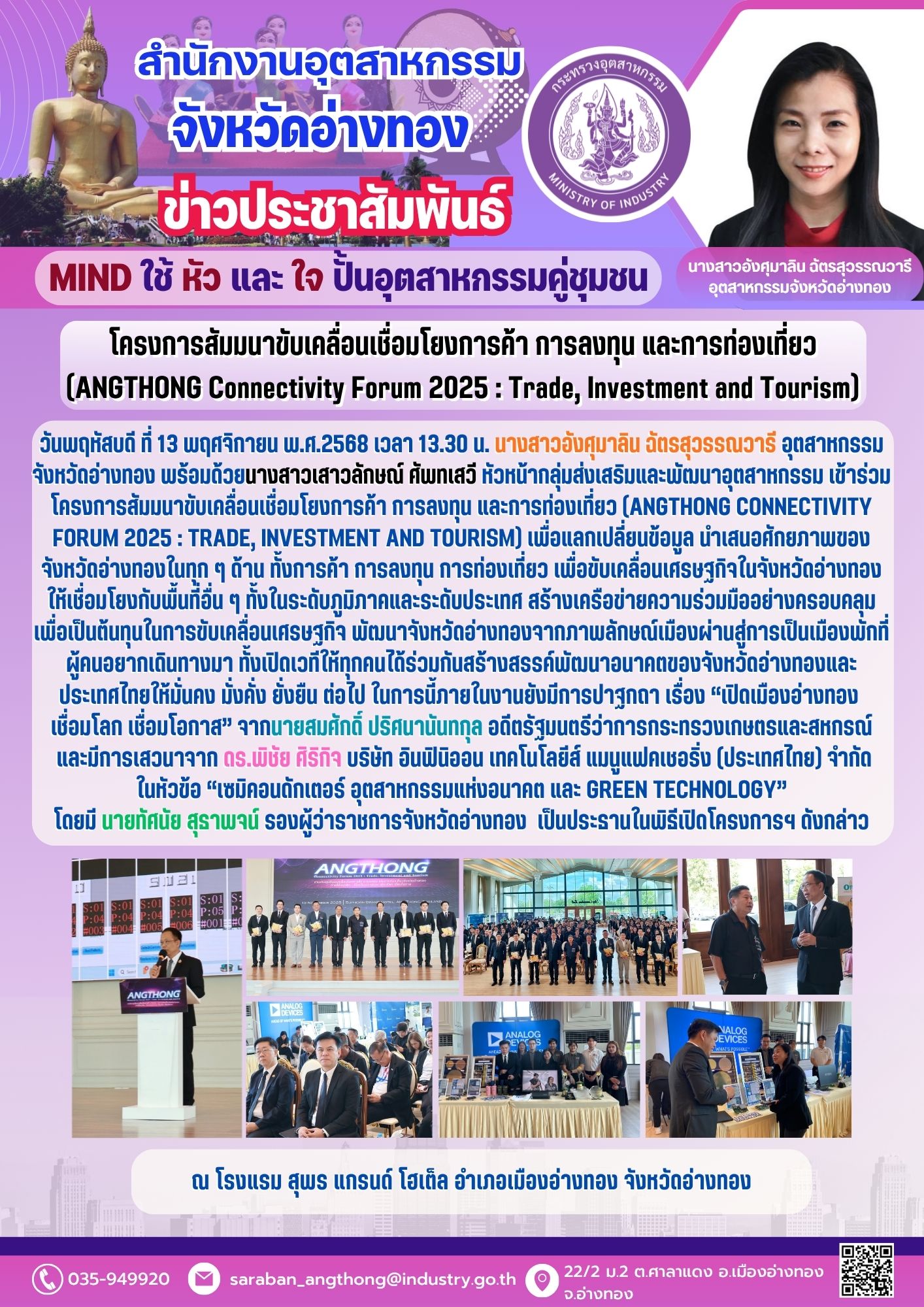 วันพฤหัสบดี ที่ 13 พฤศจิกายน พ.ศ.2568 เวลา 13.30 น. นางสาวอังศุมาลิน ฉัตรสุวรรณวารี อุตสาหกรรมจังหวัดอ่างทอง พร้อมด้วยนางสาวเสาวลักษณ์ ศัพทเสวี หัวหน้ากลุ่มส่งเสริมและพัฒนาอุตสาหกรรม เข้าร่วมโครงการสัมมนาขับเคลื่อนเชื่อมโยงการค้า การลงทุน และการท่องเที่ยว (ANGTHONG Connectivity Forum 2025 : Trade, Investment and Tourism) เพื่อแลกเปลี่ยนข้อมูล นำเสนอศักยภาพของจังหวัดอ่างทองในทุก ๆ ด้าน ทั้งการค้า การลงทุน การท่องเที่ยว เพื่อขับเคลื่อนเศรษฐกิจในจังหวัดอ่างทองให้เชื่อมโยงกับพื้นที่อื่น ๆ ทั้งในระดับภูมิภาคและระดับประเทศ สร้างเครือข่ายความร่วมมืออย่างครอบคลุมเพื่อเป็นต้นทุนในการขับเคลื่อนเศรษฐกิจ พัฒนาจังหวัดอ่างทองจากภาพลักษณ์เมืองผ่านสู่การเป็นเมืองพักที่ผู้คนอยากเดินทางมา ทั้งเปิดเวทีให้ทุกคนได้ร่วมกันสร้างสรรค์พัฒนาอนาคตของจังหวัดอ่างทองและประเทศไทยให้มั่นคง มั่งคั่ง ยั่งยืน ต่อไป ณ โรงแรม สุพร แกรนด์ โฮเต็ล อำเภอเมืองอ่างทอง จังหวัดอ่างทอง ในการนี้ภายในงานยังมีการปาฐกถา เรื่อง “เปิดเมืองอ่างทอง เชื่อมโลก เชื่อมโอกาส” จากนายสมศักดิ์ ปริศนานันทกุล อดีตรัฐมนตรีว่าการกระทรวงเกษตรและสหกรณ์ และมีการเสวนาจาก ดร.พิชัย ศิริกิจ บริษัท อินฟินิออน เทคโนโลยีส์ แมนูแฟคเชอริ่ง (ประเทศไทย) จำกัด ในหัวข้อ “เซมิคอนดักเตอร์ อุตสาหกรรมแห่งอนาคต และ Green Technology” โดยมี นายทัศนัย สุธาพจน์ รองผู้ว่าราชการจังหวัดอ่างทอง เป็นประธานในพิธีเปิดโครงการฯ ดังกล่าว