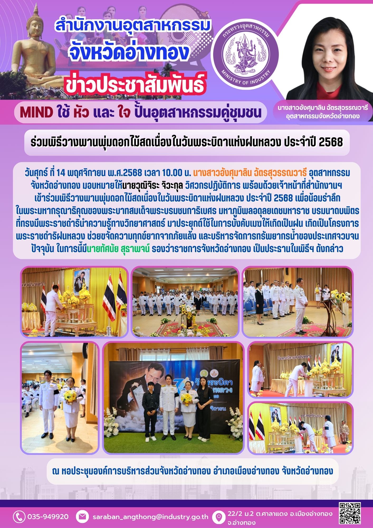 วันศุกร์ ที่ 14 พฤศจิกายน พ.ศ.2568 เวลา 10.00 น. นางสาวอังศุมาลิน ฉัตรสุวรรณวารี อุตสาหกรรมจังหวัดอ่างทอง มอบหมายให้นายวุฒิจิระ จิวะกุล วิศวกรปฏิบัติการ พร้อมด้วยเจ้าหน้าที่สำนักงานฯ เข้าร่วมพิธีวางพานพุ่มดอกไม้สดเนื่องในวันพระบิดาแห่งฝนหลวง ประจำปี 2568 เพื่อน้อมรำลึกในพระมหากรุณาธิคุณของพระบาทสมเด็จพระบรมชนกาธิเบศร มหาภูมิพลอดุลยเดชมหาราช บรมนาถบพิตร ที่ทรงมีพระราชดำรินำความรู้ทางวิทยาศาสตร์ มาประยุกต์ใช้ในการบังคับเมฆให้เกิดเป็นฝน เกิดเป็นโครงการพระราชดำริฝนหลวง ช่วยขจัดความทุกข์ยากจากภัยแล้ง และบริหารจัดการทรัพยากรน้ำของประเทศจวบจนปัจจุบัน ณ หอประชุมองค์การบริหารส่วนจังหวัดอ่างทอง อำเภอเมืองอ่างทอง จังหวัดอ่างทอง ในการนี้มีนายทัศนัย สุธาพจน์ รองว่าราชการจังหวัดอ่างทอง เป็นประธานในพิธีฯ ดังกล่าว