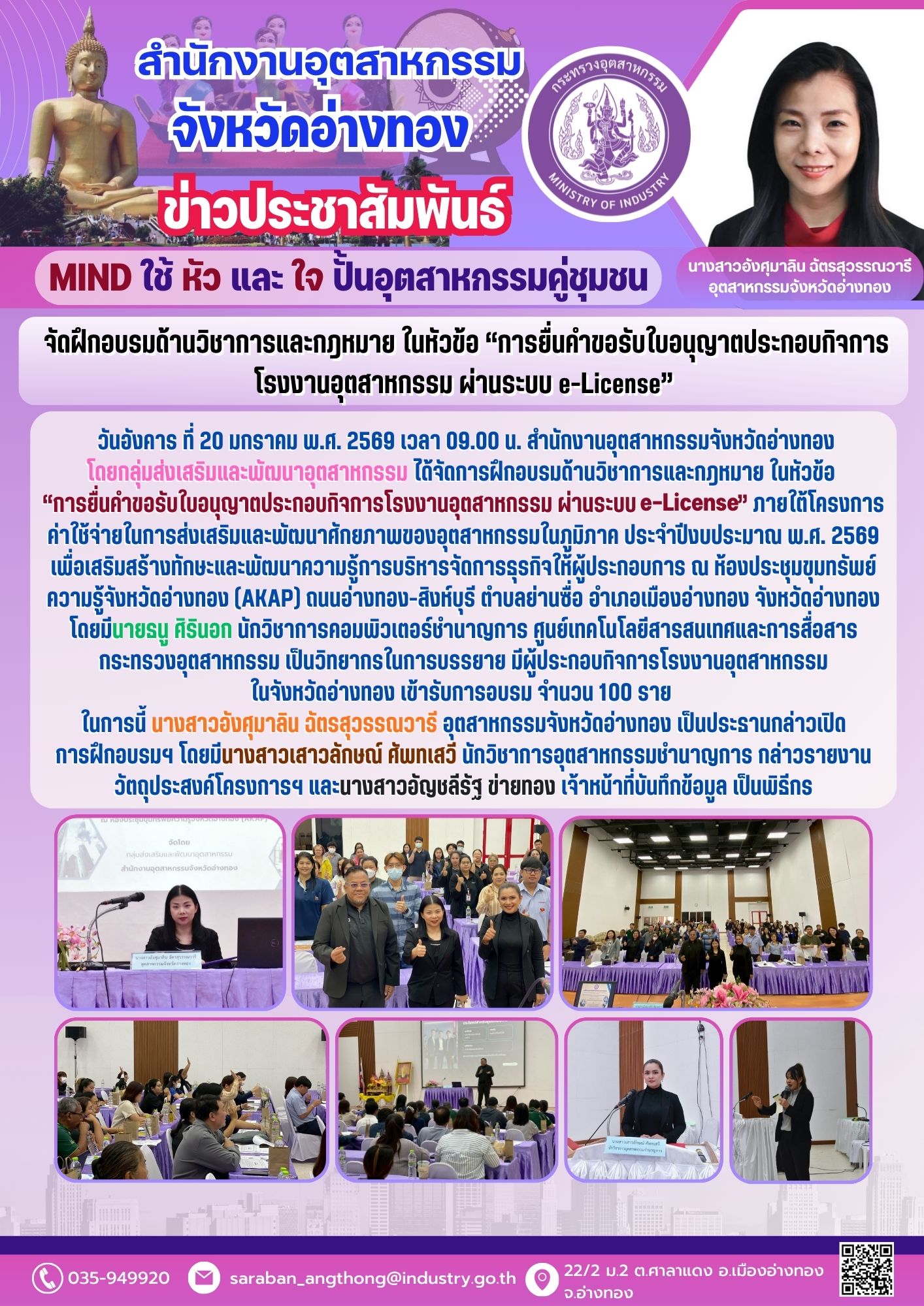 วันอังคาร ที่ 20 มกราคม พ.ศ. 2569 เวลา 09.00 น. สำนักงานอุตสาหกรรมจังหวัดอ่างทอง โดยกลุ่มส่งเสริมและพัฒนาอุตสาหกรรม ได้จัดการฝึกอบรมด้านวิชาการและกฎหมาย ในหัวข้อ “การยื่นคำขอรับใบอนุญาตประกอบกิจการโรงงานอุตสาหกรรม ผ่านระบบ e-License” ภายใต้โครงการค่าใช้จ่ายในการส่งเสริมและพัฒนาศักยภาพของอุตสาหกรรมในภูมิภาค ประจำปีงบประมาณ พ.ศ. 2569 เพื่อเสริมสร้างทักษะและพัฒนาความรู้การบริหารจัดการธุรกิจให้ผู้ประกอบการ ณ ห้องประชุมขุมทรัพย์ความรู้จังหวัดอ่างทอง (AKAP) ถนนอ่างทอง-สิงห์บุรี ตำบลย่านซื่อ อำเภอเมืองอ่างทอง จังหวัดอ่างทอง โดยมีนายธนู ศิรินอก นักวิชาการคอมพิวเตอร์ชำนาญการ ศูนย์เทคโนโลยีสารสนเทศและการสื่อสาร กระทรวงอุตสาหกรรม เป็นวิทยากรในการบรรยาย มีผู้ประกอบกิจการโรงงานอุตสาหกรรมในจังหวัดอ่างทอง เข้ารับการอบรม จำนวน 100 ราย ในการนี้ นางสาวอังศุมาลิน ฉัตรสุวรรณวารี อุตสาหกรรมจังหวัดอ่างทอง เป็นประธานกล่าวเปิดการฝึกอบรมฯ โดยมีนางสาวเสาวลักษณ์ ศัพทเสวี นักวิชาการอุตสาหกรรมชำนาญการ กล่าวรายงานวัตถุประสงค์โครงการฯ และนางสาวอัญชลีรัฐ ข่ายทอง เจ้าหน้าที่บันทึกข้อมูล เป็นพิธีกร